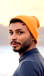 Striking pose on the beach at sunset, Marcos Dias exudes confidence with his yellow beanie and blue shirt.