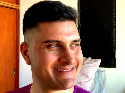 A man with a short haircut and a hairstyle. He appears to be in his late 20s or early 30s, with visible tattoos on the upper arms and a beard. The individual is indoors and is wearing a sleeveless shirt that reveals part of his torso.