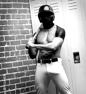 This image captures the alluring persona of a masked jock, portraying an athletic figure poised with a baseball bat. The model's pose and attire evoke a sense of strength and masculinity. This Onlyfans model exudes confidence and is ready for a game of baseball.