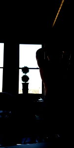 The image depicts an indoor setting, possibly a dining area within a home or restaurant. The view is from the perspective of someone standing near a window or doorway, offering a glimpse into the room where the subject is present. The space looks inviting and comfortable, with warm lighting that enhances the homely atmosphere. The masked model is positioned to the side, adding an element of intrigue and mystery. There is no text visible in the image.