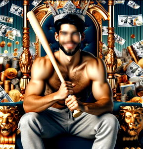 In this dynamic image, Master Buster, an OnlyFans model, exudes confidence and strength. He is seated on a throne made of stacks of money, symbolizing his affluence and success. Dressed in a golden crown and holding a baseball bat, he embodies the spirit of royalty and power. The surrounding environment is richly detailed with luxurious elements such as gold coins, a gold-plated throne, and regal attire. His pose is one of dominance and ease, adding to his persona as a powerful figure. This image captures Master Buster's unique blend of physical prowess, financial success, and royal charm.