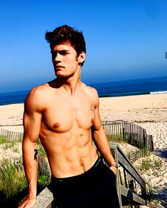 A model named Kenzie R. stands confidently against a beach backdrop, showcasing his athletic build in a shirtless pose. His gaze is directed off to the side, suggesting a moment of relaxation or contemplation.