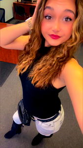 In this selfie, MeMe captures her confidence and style. She is wearing a black crop top paired with high-waisted jeans and black boots. Her pose suggests she's in a casual yet stylish setting. The background includes a desk and office chairs, indicating that the photo might have been taken in an office environment.