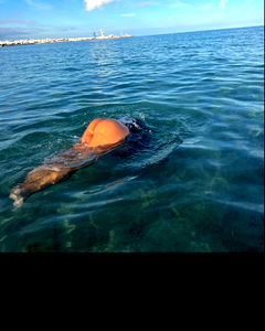 A photograph of a woman modeling in a bikini, standing waist-deep in the water with her hands outstretched. She is at night and appears to be enjoying herself. The image is from an OnlyFans profile.