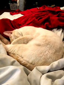 The OnlyFans model, u8360874, is enjoying a peaceful moment curled up on a bed. The white and orange cat is nestled comfortably on the unmade bed, surrounded by soft textures. A red blanket adds a pop of color to the scene, creating an inviting and cozy atmosphere.