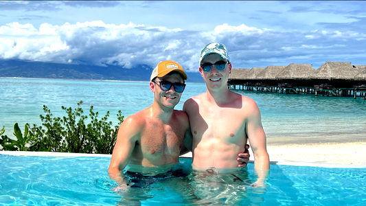 Mike and Pat, enjoying their time at a beautiful tropical destination, pose for a memorable photo. They are both holding cocktails and seem to be relishing their vacation. The serene waters and overwater bungalows in the background add to the idyllic setting.