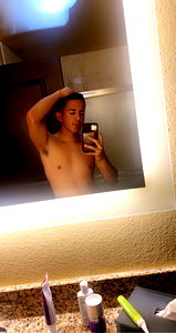 Intimate and candid moment of Mikeyy, the popular OnlyFans model, captured while taking a selfie in front of the bathroom mirror during his photoshoot. His toned physique and confident expression are evident. The background features a well-lit bathroom with a white countertop. Age: 30, Gender: Male