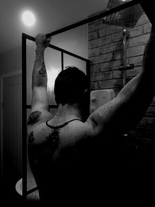 Mindofmark95, a fitness model based on the Isle of Wight, is captured in mid-exercise. With his chiseled physique and professional attire, he embodies both strength and style.
