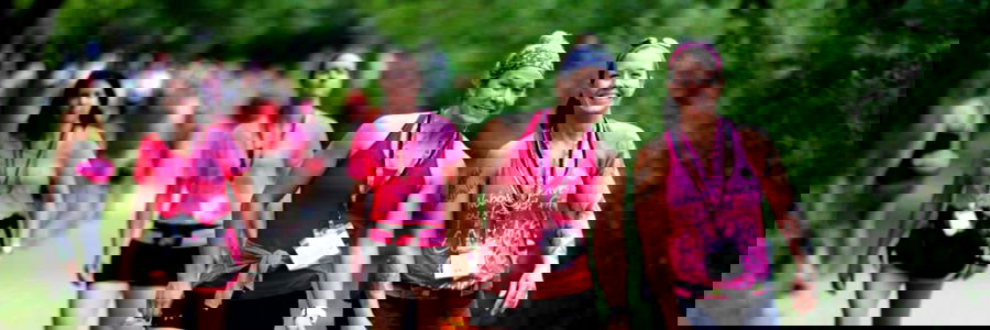 A group of four women are jogging outdoors on a trail. They all appear to be dressed for athletic activities and are smiling towards the camera. One woman is wearing a pink shirt, another has a ponytail with red hair, and the third and fourth are slightly blurred in the background. They seem to be enjoying a day of exercise together.