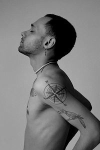 The model appears relaxed and comfortable in front of the camera. He is wearing a casual outfit that includes a hoodie and jeans, which contributes to his laid-back appearance. The background is nondescript, allowing the focus to remain on him.