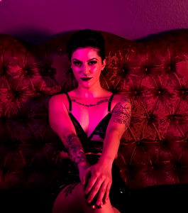A sultry and seductive OnlyFans model with tattoos, leaning against the wall of a purple-lit studio. She sports a bralette, lingerie, and high heels, exuding confidence as she poses on a couch with her finger resting thoughtfully on her chin.