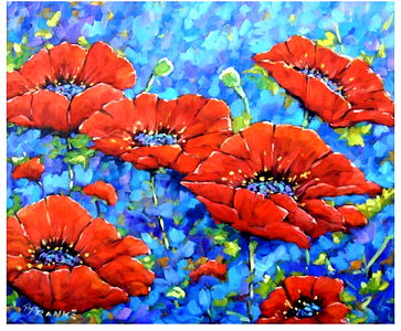 This is an art piece depicting a vibrant flower field in full bloom. The poppies are the stars of this canvas, painted in striking red hues that contrast beautifully against the lush green foliage. This painting is rich with detail and color, capturing the essence of a sunny day spent amidst nature's beauty. It would make an excellent piece for anyone who loves floral scenes and nature paintings.