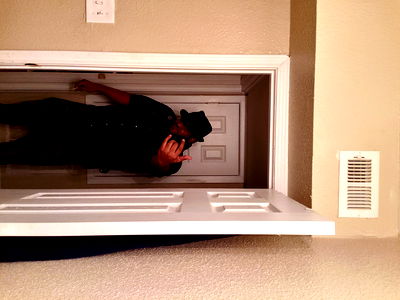 The man is standing in front of a mirror in an apartment hallway. He is holding a phone and making a face, capturing the moment for his OnlyFans audience.