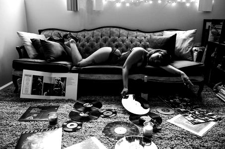 In this image, we see Mz Money Paws from Oahu in a candid moment. She is comfortably sprawled out on a couch, surrounded by an array of vinyl records, hinting at her appreciation for music. The room has a warm ambiance with a soft glow coming from fairy lights. A window reveals a glimpse of the outside world, adding depth to the scene.