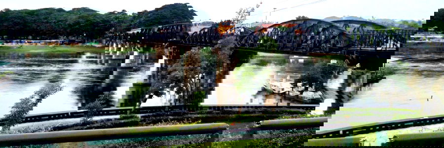 A serene image capturing the beauty of a large black bridge that crosses a body of water. The bridge is set against a backdrop of greenery, indicating it's surrounded by nature. In the distance, there are boats on the water, suggesting recreational or commercial activities. The sky above appears clear, with no clouds visible.