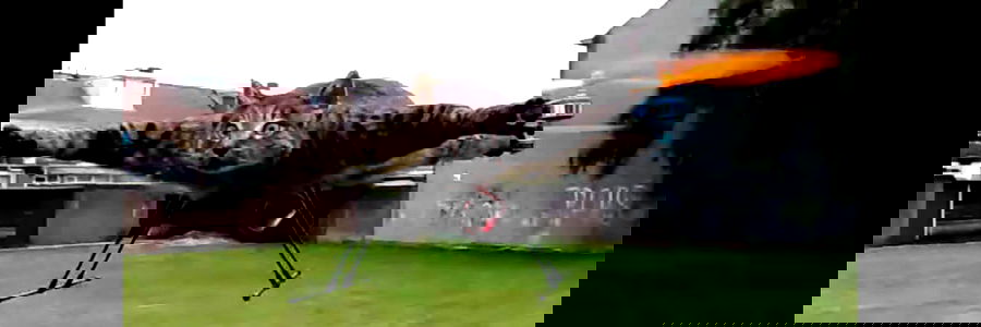 This image captures the adventurous spirit of Arnold, Nicholas, showcasing his pet cat engaged in an unusual and playful activity. It appears to be a sunny day, as suggested by the shadows cast on the ground. The drone is small and seems to be enjoying the flight. It's a delightful scene that demonstrates a unique bond between the model and his feline friend.