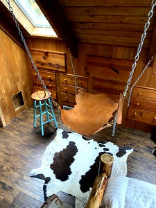 The image showcases a cozy log cabin interior with warm tones and rustic charm. A central swing chair hangs from the ceiling, inviting relaxation, adjacent to a seating area with a wooden bench and stools. The space is accentuated by a large window that allows natural light to flood in, highlighting the wood paneling and plaid rug that add to the cabin's rustic appeal.