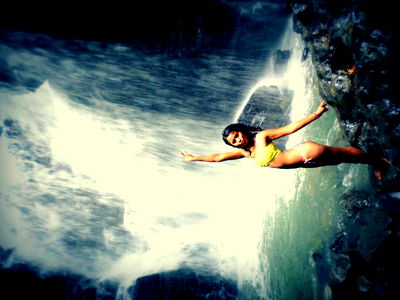 A stunning woman posing in a body of water, showcasing her figure and style. She's wearing a pink top that contrasts with the natural surroundings.