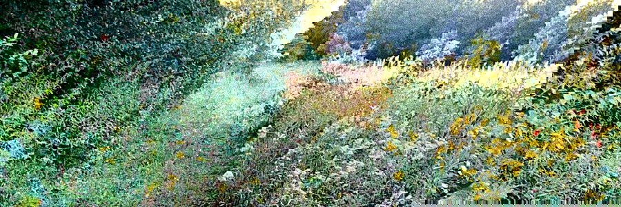 A tranquil riverside scene with a carpet of wildflowers, set against a backdrop of a serene river and overcast sky. A solitary figure can be seen in the distance, adding to the sense of solitude and peace.