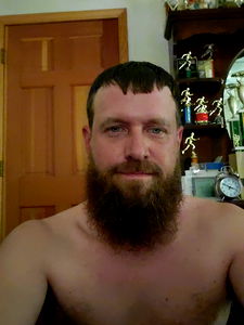 The image shows a man with a beard and mustache, taking a mirror selfie. He appears to be indoors, likely in a home setting, as suggested by the presence of personal items and a domestic environment. The photo has a casual, candid feel to it, capturing a moment of the individual's daily life.