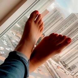 A model lounging with her feet up on a balcony, showcasing her toenails. The scene is set in an urban environment with buildings and cars visible through the window.