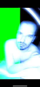 A striking black and white image of an OnlyFans model posing on a bed, with vibrant color filters applied to various areas of the photo. The model is positioned in such a way that they appear as if sitting on the back of the bed. The lighting creates dramatic shadows and highlights, adding to the moody and artistic feel of the image.