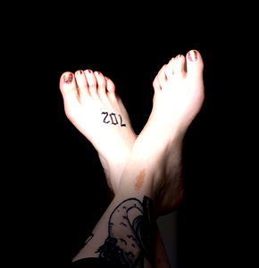 A close-up photo of the tattoo artist Shy showing off her feet with tattoos. Her foot with a T is on display, along with her toe nails painted black. The black and white tone adds an artistic touch to the image.