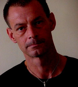 A young adult male, seen in a relaxed posture against a neutral background. His expression is neutral with a hint of pensiveness.