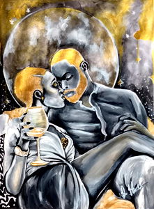 A captivating digital art piece featuring a couple in an intimate embrace under the glow of a full moon. The artist has skillfully used warm colors and textures to create a sense of depth and emotion.