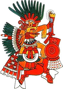 A vibrant and dynamic image featuring a central figure dressed in traditional attire, accompanied by symbols of power and prosperity. The art style leans towards the Aztec motif with its color palette and intricate patterns.