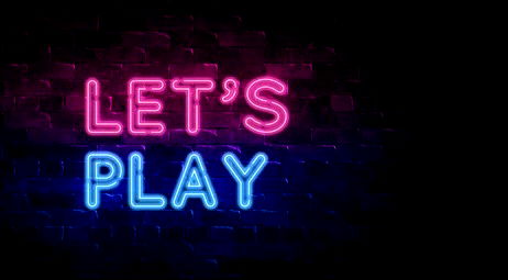 Stylish and colorful neon sign with a playful message, perfect for game enthusiasts or streamers. The sign has a vibrant pink background with the phrase 'Let's Play' written in blue. It's mounted on a brick wall. The sign is ideal as a decoration for gaming rooms, storefronts, or events related to video games and streaming.