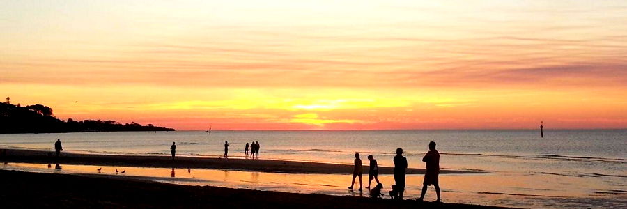 The image captures a serene moment at dusk on a beach, with warm hues painting the sky as the sun sets. A few individuals are present, walking along the sandy shore, and silhouettes of buildings can be seen on the horizon. The atmosphere is peaceful, as people seem to take in the beauty of nature and enjoy their time together. The photo has a certain artistic quality due to the soft focus and selective coloring.