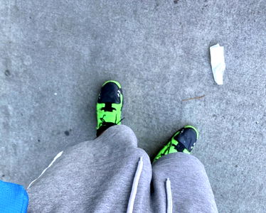 A person is seen in mid-stride, wearing sneakers with neon accents. They are captured from the back, showing their casual attire. The individual appears to be in a relaxed state while navigating the urban environment.