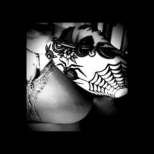 A tattooed individual with long hair and a noticeable spider web tattoo on their arm. They are captured in an intimate pose, covering their face with one hand.