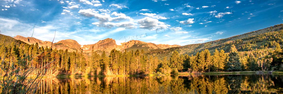 Stunning landscape of a tranquil mountain lake with majestic mountains in the background. The picture is taken from a distance, showcasing both the lake and the surrounding nature. The sky is partly cloudy, suggesting either dawn or dusk. The colors are natural and vivid.