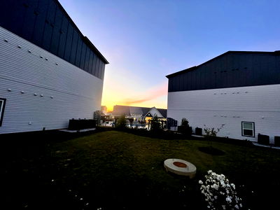 The image showcases a tranquil scene of the sun setting behind a white building with a clear sky, likely captured during spring or summer. The sun's rays are beautifully scattered across the sky, casting a warm glow on the surrounding area and highlighting the wooden texture of the building. This serene view is bathed in hues of orange and yellow, adding to the picturesque setting. There's also some greenery visible near the building, which contributes to the peaceful ambiance of the scene.