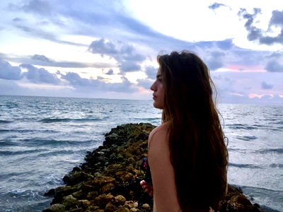 Maddie radiates evening elegance with her long hair and captivating gaze, set against a calming backdrop. She is captured mid-glare, adding a touch of intrigue to the image.