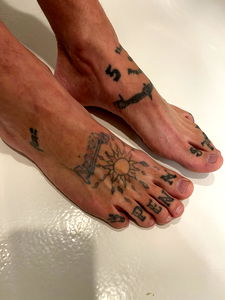 In this close-up image, the foot of a person with a foot fetish is showcased. The foot features vibrant tattoos and bears the text 'Big 10'. The toes are distinctly visible and reveal an intricate design, indicative of the owner's interest in foot artistry. The background is minimal, drawing focus to the detailed tattoo on the sole. A bathroom sink can be seen, suggesting a personal and intimate setting.