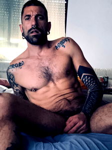 An adult content creator posing for the camera with a confident and muscular physique. The model has tattoos, a beard, and is topless.