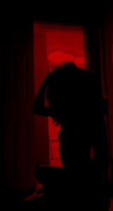 Silhouetted figure of a young female, possibly an adult, in a purple hue against a dark background. The model is poised and slender, with her hands gently placed on the window frame. She appears to be looking out or beyond the window.