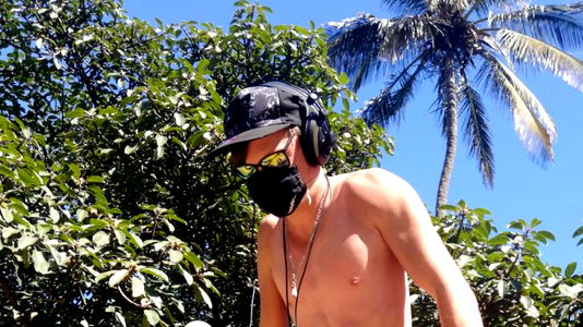 OnlyFans model Danny Love in a tree, shirtless, with handcuffed wrists. Shirtless man hanging from a tree. OnlyFans model poses for a photo in the forest.