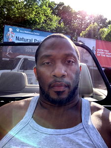 Model Rabbar poses for a car photo. He wears a black t-shirt with the word 'STRAIGHT' on it and has a beard. His relaxed expression is accentuated by the open window of the vehicle. In the background, there are trees, indicating that the car might be parked in an urban park setting.