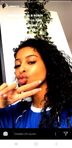 The image is a screenshot from an Instagram account showing a model posing for the camera. She appears to be in her late twenties or early thirties and has long, wavy hair. The model seems to be confidently striking a pose with one hand near her face. There are captions overlaying the image that say 'Instagram is a scam' and 'Dont believe everything you see.'