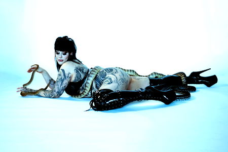 A captivating scene of OnlyFans model Raven Munroe, an Australian tattooed beauty, immersed in a latex ensemble and striking pose on the floor. Her dark hair contrasts with her bright tattoos and her gaze is as intriguing as her attire.