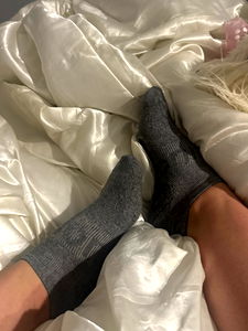 A professional model wearing gray knee-high socks from Adidas. She is lying on a soft, white bed with a cream satin bedding. Her legs are crossed and she has a minimalistic makeup look. The image captures her relaxed and comfortable demeanor.