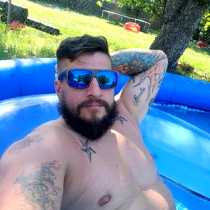 An illustrated male OnlyFans model. The character is depicted as a tattooed, beard-wearing adult man wearing sunglasses and posing in swimwear with a confident pose.