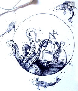 A detailed tattoo design featuring a skull adorned with floral patterns and a circular motif. The tattoo is presented on a page from an album, giving the impression of a carefully crafted piece of body art.