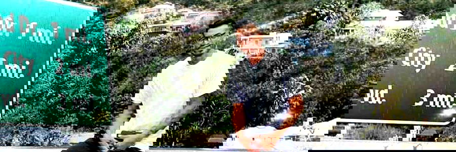 This is a photo of Raymond Martinez posing outdoors, standing next to a street sign that has the words '1 MILE' along with other road information. He appears to be in good spirits and enjoying his time. The background suggests a warm climate, possibly near a beach or coastal area given the greenery and the clear sky.