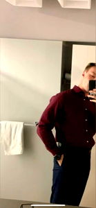 Robbie, the OnlyFans model, exudes confidence and professionalism. Dressed in a maroon shirt and dark pants, he stands against a pristine white wall, his hands casually tucked into his pockets. His gaze is direct and engaging, hinting at the charisma that makes him stand out.