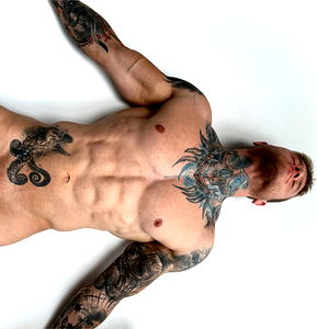 Rostrailer, a renowned tattooed fitness model, strikes a pose with his hands gently resting on his knees. His toned muscles and visible tattoos hint at the dedication he puts into his workouts.